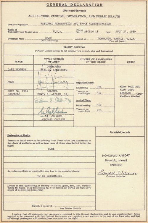Burocracia para mim se enquadra na categoria das top 10 coisas mais chatas do mundo.  Reconhecer firma , xerox autenticadas, formulários como a da imigração brasileira que pede para você declarar em que assento estava durante o voo (o que isto muda para a alfândega ??? – sempre declaro que sentei na fila 1, assento A, assim pensam que eu vim de primeira classe e sou importante)… Tenho a impressão que tudo isto serve apenas para deixar donos de cartórios e gráficas sorridentes e mais ricos. Sempre associei este problema a um fenômeno do Brasil com uma grande contribuição da legítima colonização portuguesa com a qual fomos brindados. Hoje estava navegando pela web e encontrei uma coisa bizarra…descobri que os astronautas da Apolo, depois de sua viagem a lua,no retorno a Terra, também preencheram formulário de imigração ! Pior: declararam que estavam trazendo amostras de terra e pedra ! Ou seja, as coisas tem potencial para ficarem piores…